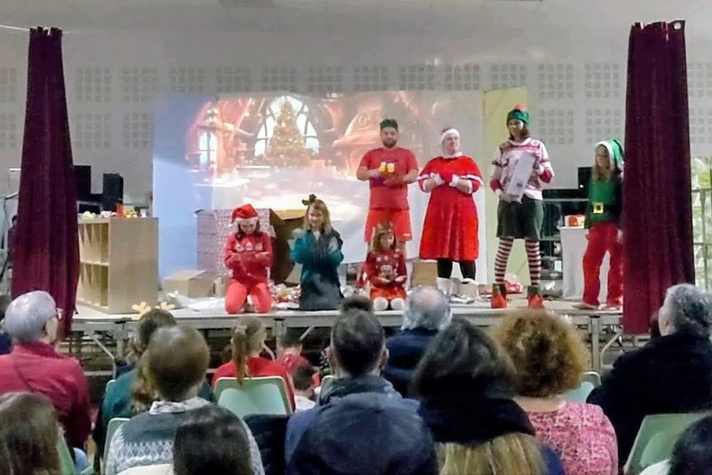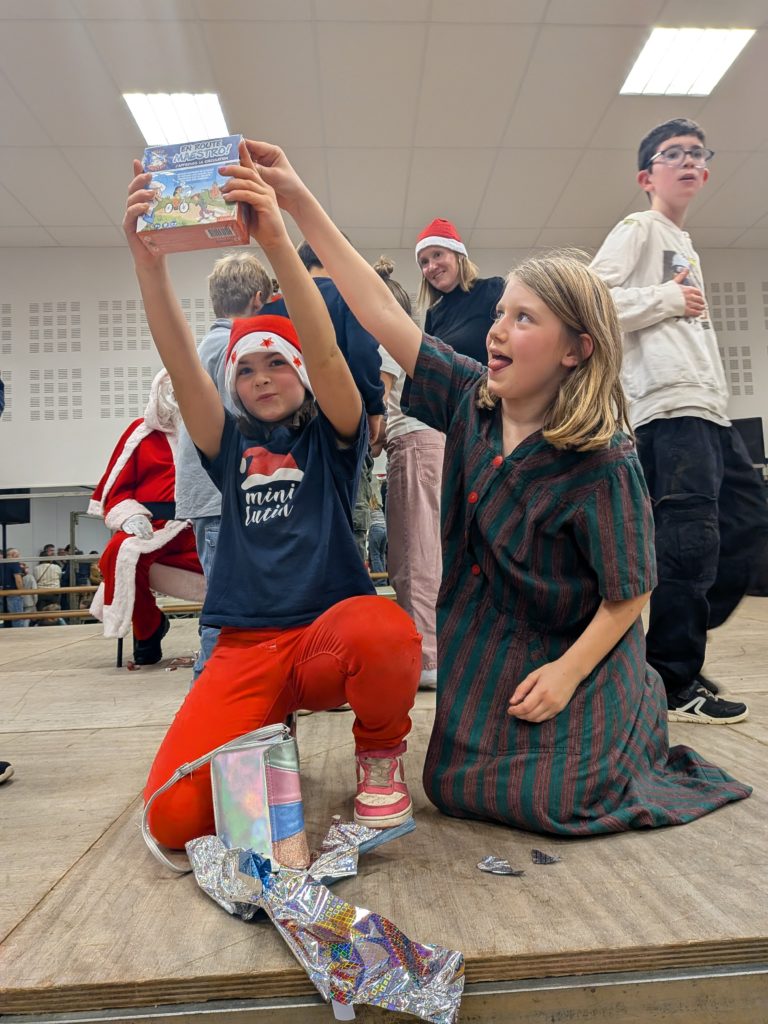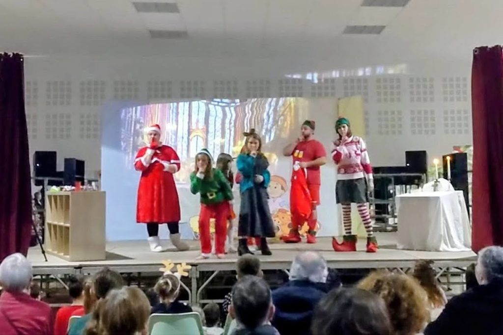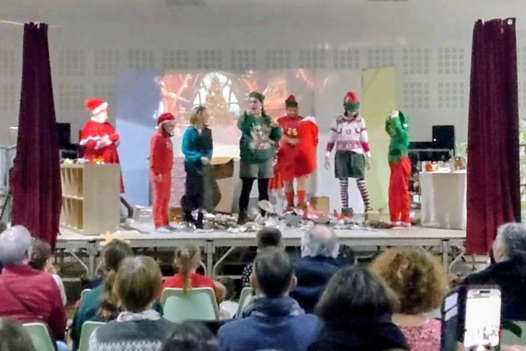 Puis le rideau s’est levé sur la pièce de théâtre « Le lutin farceur et la course aux jouets », imaginée et mise en scène par des parents d’élèves. 🎭 Sur scène, un lutin malicieux avait caché les cadeaux ; dans la salle, enfants et parents se sont transformés en enquêteurs, invités à l’aider à retrouver tous les paquets. Rires, surprises, petits moments d’improvisation… Bravo aux comédiens amateurs, aux accessoiristes et à toute l’équipe de l’ombre qui ont donné vie à cette histoire pleine de malice.