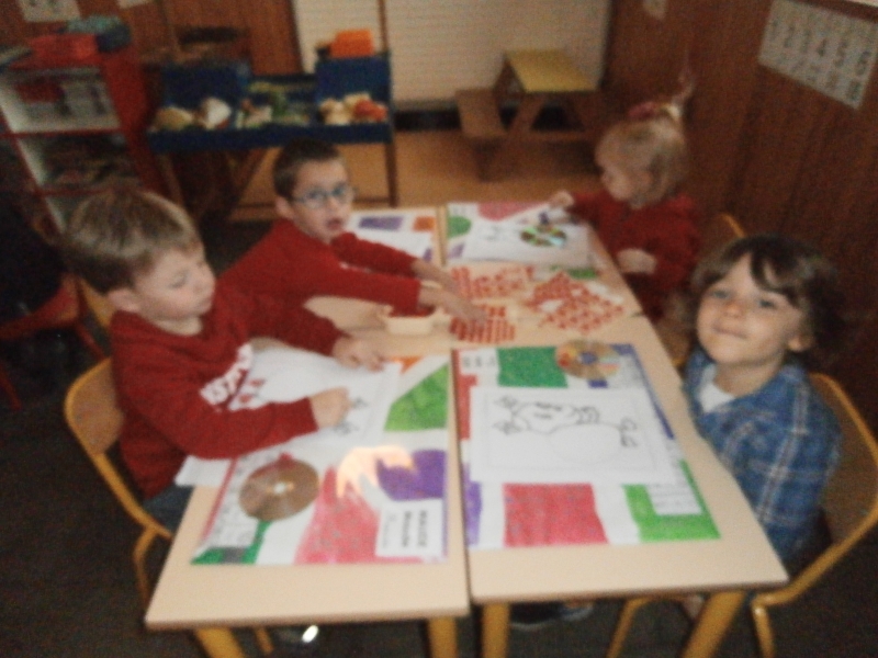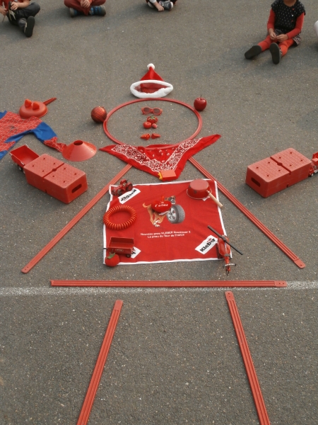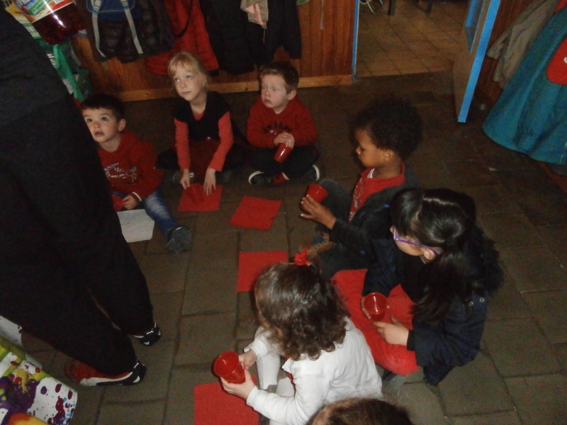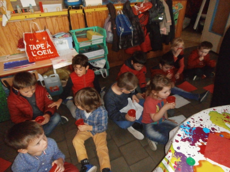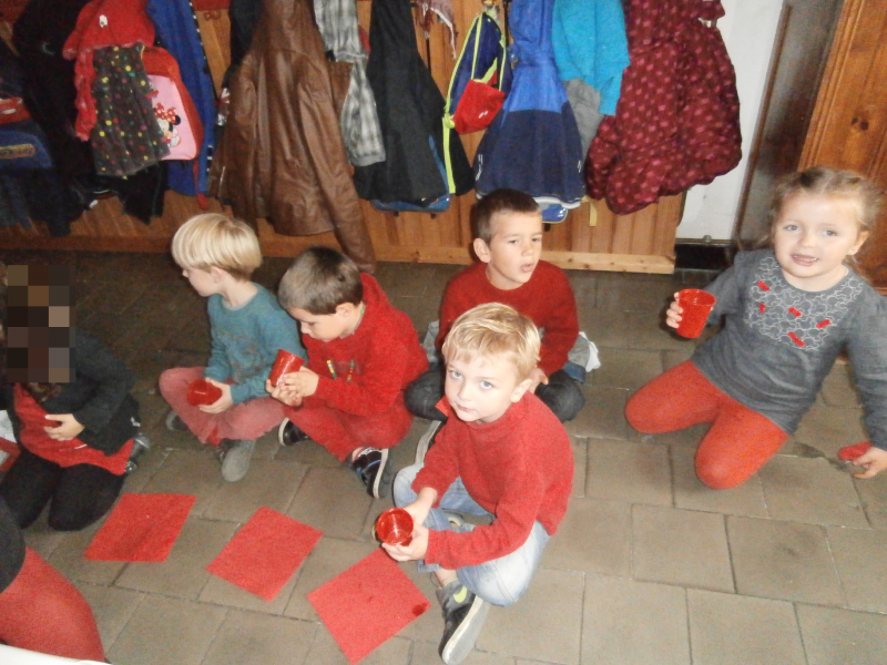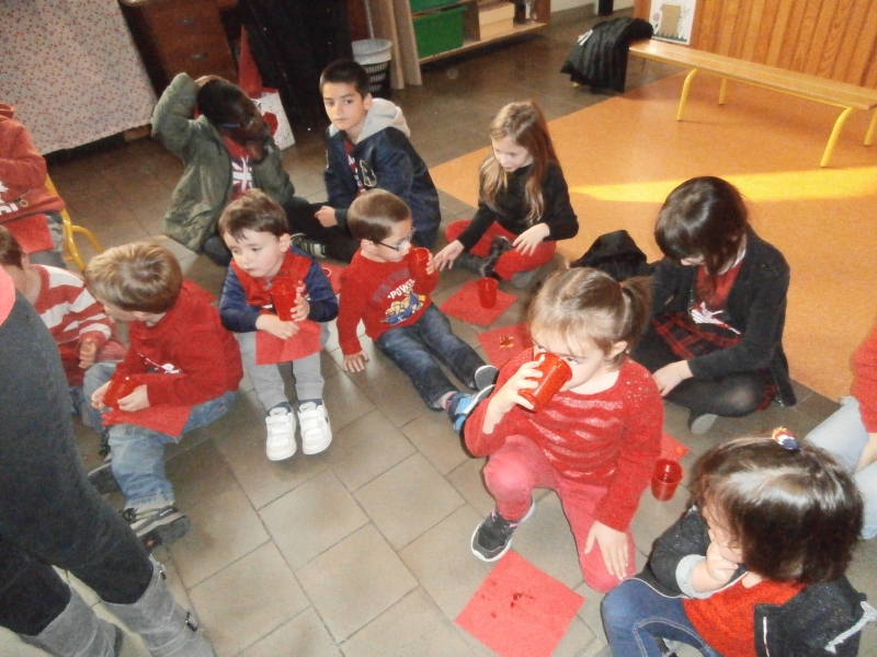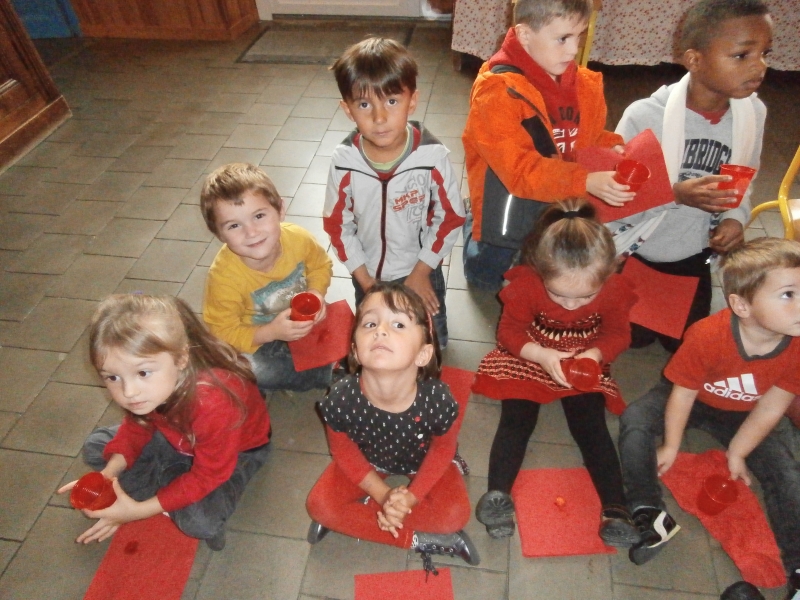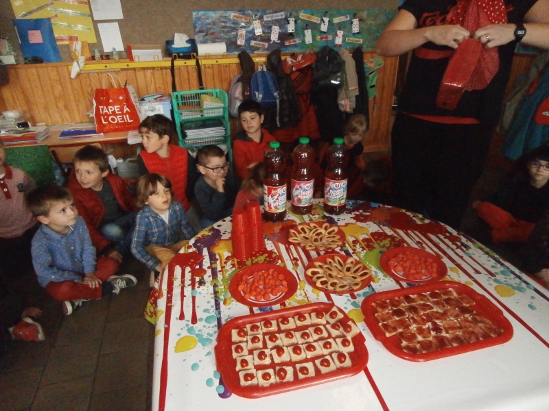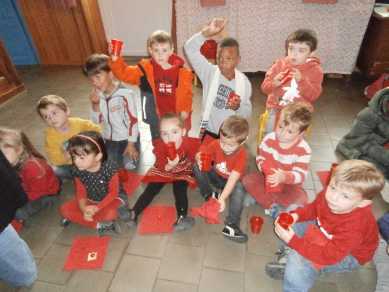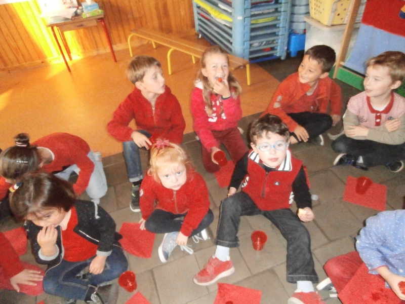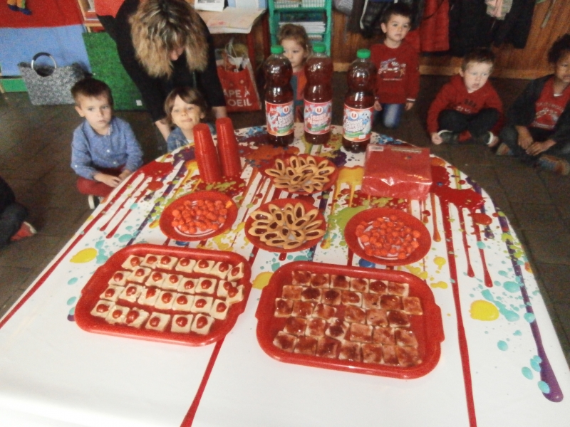 Lundi 16 octobre, tous les élèves de petite et moyenne sections sont arrivés habillés en rouge pour cette journée particulière. Nous avons préparé un goûter rouge avec du jus de fruits rouge, des toasts à la tomate, de la confiture, des bonbons et des biscuits à la fraise. Nous avons invité la classe de CP/CE1 à partager notre goûter et nous avons chanté la chanson du petit clown tout rouge.