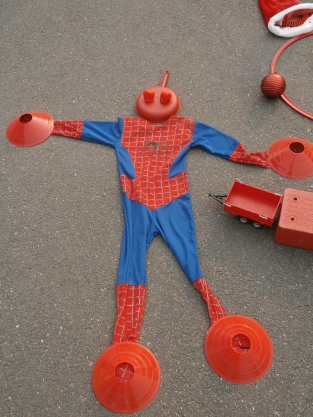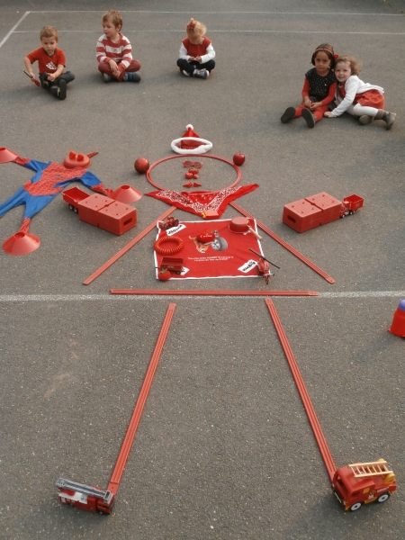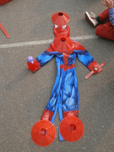 Nous avons terminé notre journée par réaliser une grande dame et un grand monsieur rouges avec tous les objets que les enfants avaient apportés.