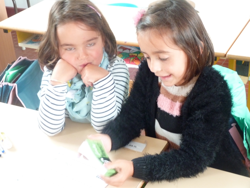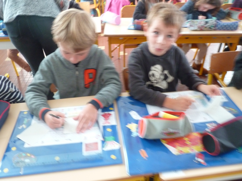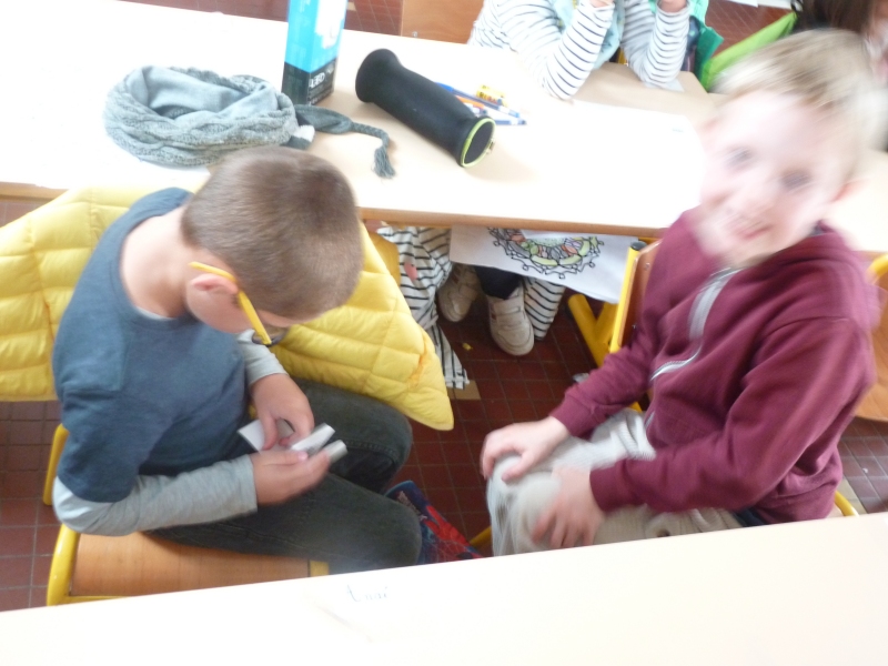 Pendant ce temps, les CP dessinaient puis coloriaient des insectes grâce à des modèles. Une fois ce travail accompli, un découpage, le plus précis possible, s’imposait à eux afin de réaliser leur film d’animation. Puis, avec Solweig, est venu le temps de créer l’animation à l’aide d’un appareil-photo relié à un appareil où les enfants déposaient leur insecte. Une 1ère photo est prise puis l’enfant bouge son insecte et une 2nde photo est prise et ainsi de suite.