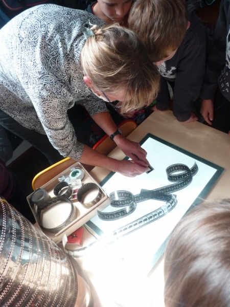 Lors de la 1ère séance, Solweig a expliqué l’importance du détail dans le dessin . De plus, elle a diffusé aux élèves quelques unes de ces animations tout en leur faisant part de son travail en amont avant d’arriver au résultat final. De plus, Solweig a partagé sa technique avec les enfants à savoir travailler sur pellicule; travail précis et méticuleux. En outre, elle a présenté aux élèves l’objectif des séances à savoir réaliser un cinéma de pouce pour les uns et un petit film d’animation pour les autres.