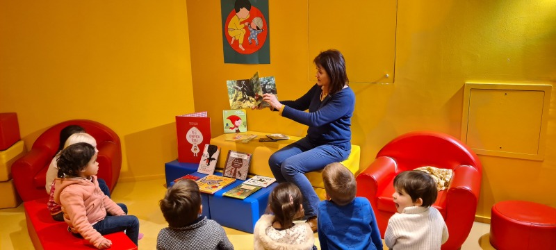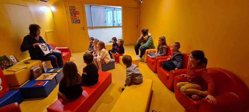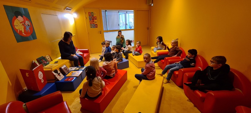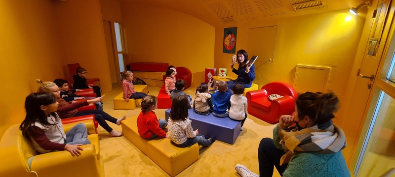 Nous avons été accueilli par une animatrice et nous nous sommes séparés en deux groupes. Le premier la suivi dans la salle jaune à l’étage pour des lectures de différentes versions de l’histoire du Petit chaperon rouge.