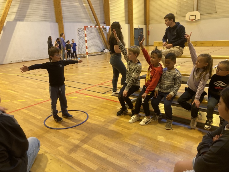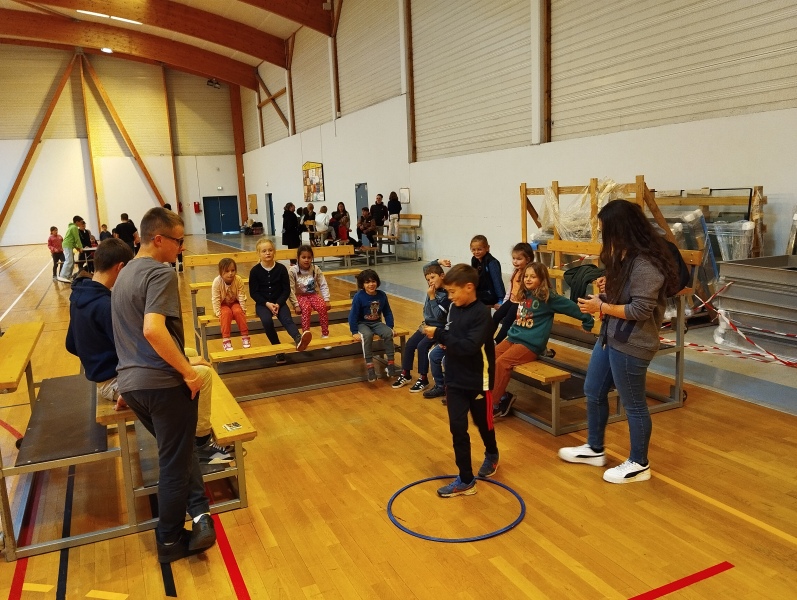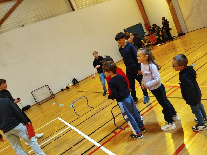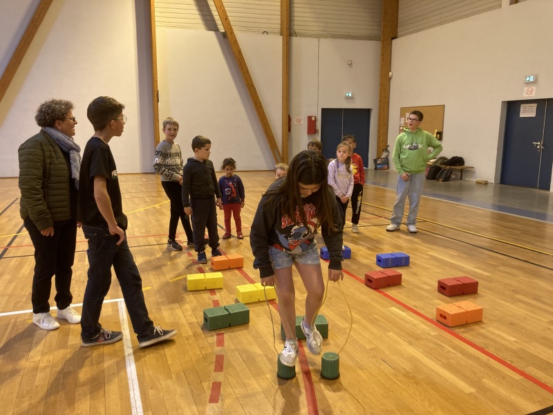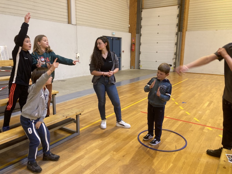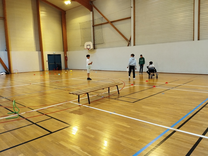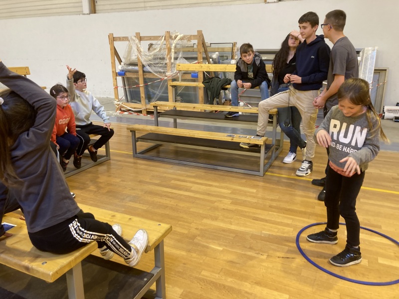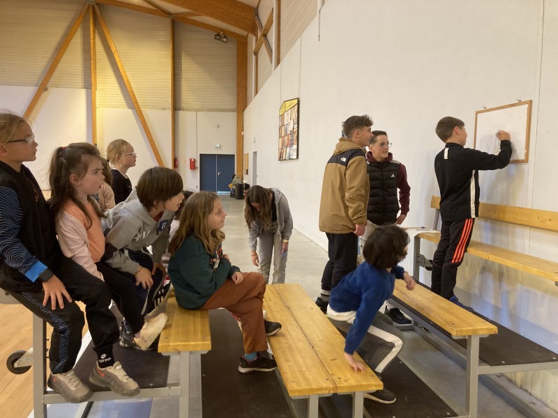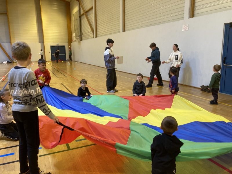 Lundi 12 mai après-midi, nous avons accueilli les élèves de 4ème du lycée agricole de Derval. La météo maussade nous a contraint à nous replier à la salle de sport afin de pouvoir profiter des activités qu’ils nous avaient préparées. Avec leur professeur de français et de sport, ils ont organisé pour nous des ateliers sportifs (parcours, parachute,…) et d’autres sur le vocabulaire (mime, dessinez c’est gagné, charades,..).