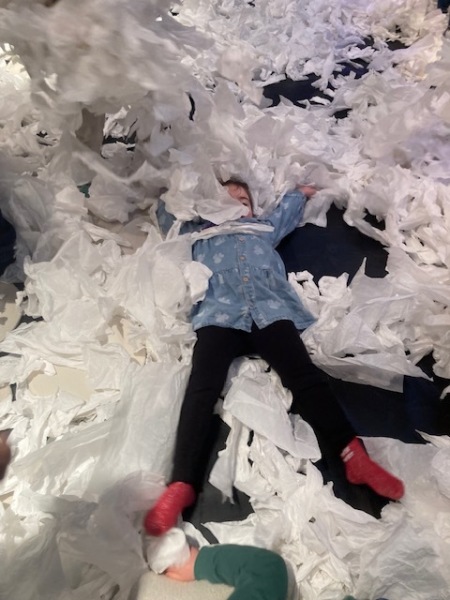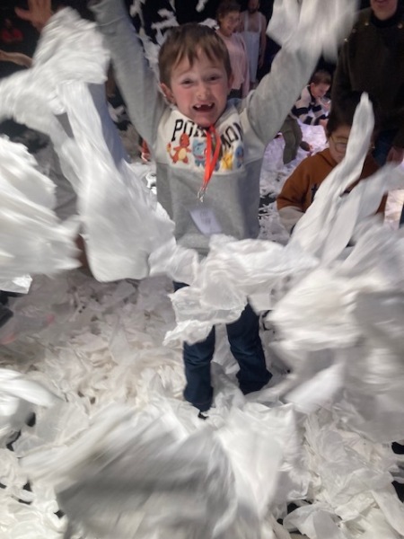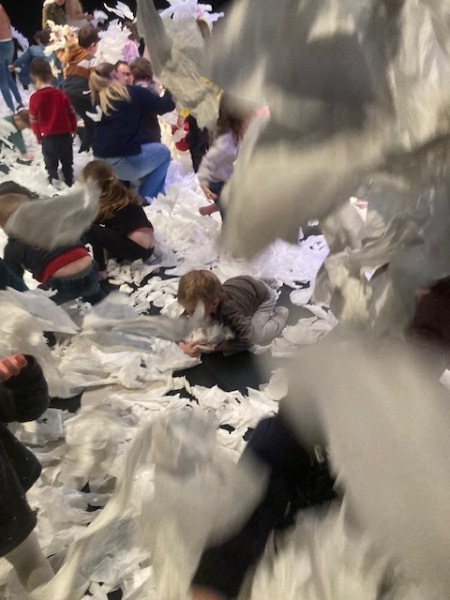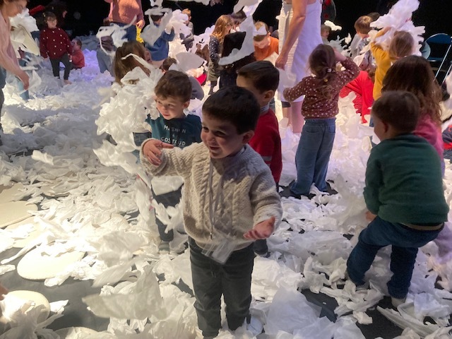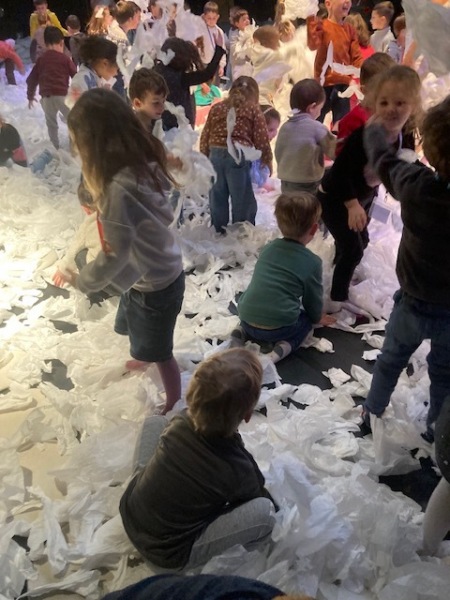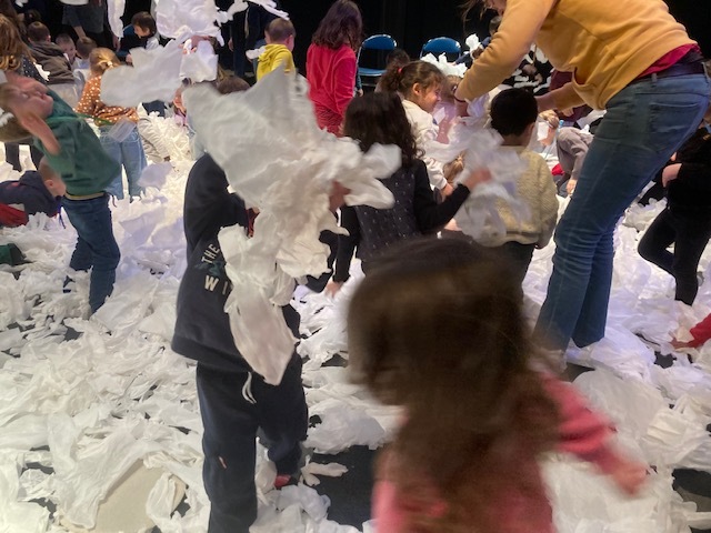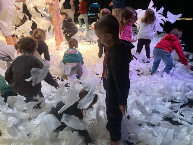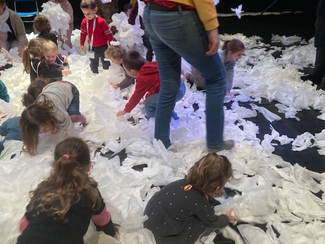 Lundi 12 janvier, les classes de PPS/PS/MS et GS/CP ont eu la chance d’assister au spectacle « Sous la neige » de la compagnie des Bestioles au théâtre de Verre. Un spectacle à la poésie visuelle et sonore. Un paysage de papiers de soie. Blancs. Froissés. Enchevêtrés. Qui semblent respirer au son du vent. Un paysage avec ses creux, ses monts, ses bosses. Un chemin vers le rêve et l’imaginaire qui se dessine.